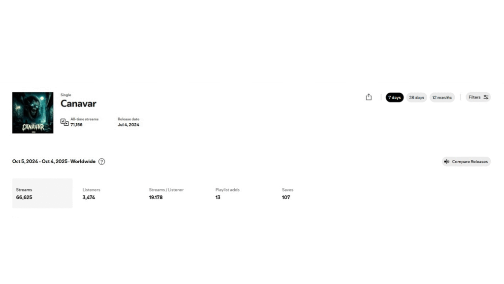 Müzik endüstrisinde yalnızca akış sayısıyla değil, dinleyici bağlılığıyla fark yaratıyoruz. Yigorich’in “Canavar” single’ı, son 7 günde ortalama 19 kereden fazla dinlenen (19.178 Streams/Listener) bir başarıya imza attı. Bu, şarkının rastgele akış değil, dinleyicinin kişisel rotasyonuna girmiş, bağımlılık yaratan bir hit olduğunu gösterir. Temmuz 2024 çıkışlı bir parçanın şu anda 66.625 akışa ulaşması ve 107 yeni kayıt (Saves) alması, doğru strateji ile patlama anının yakalanabileceğini kanıtlar